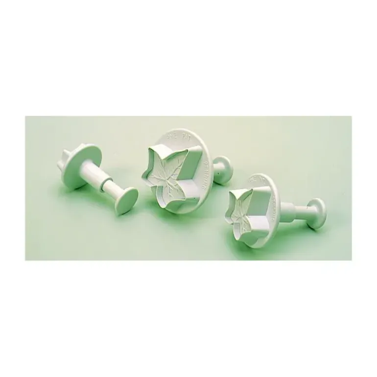 Jeu de 3 Emporte pièces à Poussoir. Le poussoir permet l’extraction facile de la pâte découpée. Ces découpoirs permettent également de marquer sur la pâte les nervures des feuilles.