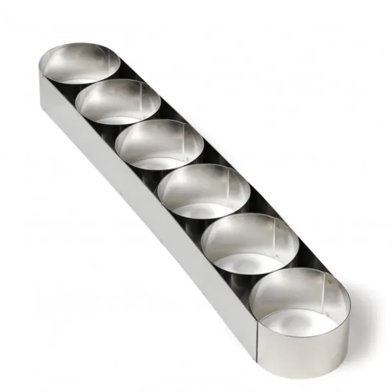 Un attelage permet de réaliser comme les professionnels, des présentations individuelles rapidement et de façon régulière. Ici, l’attelage est composé de 6 cercles à mousse (nonnettes) vous permettant ainsi de mouler vos préparations en portion individuelle.