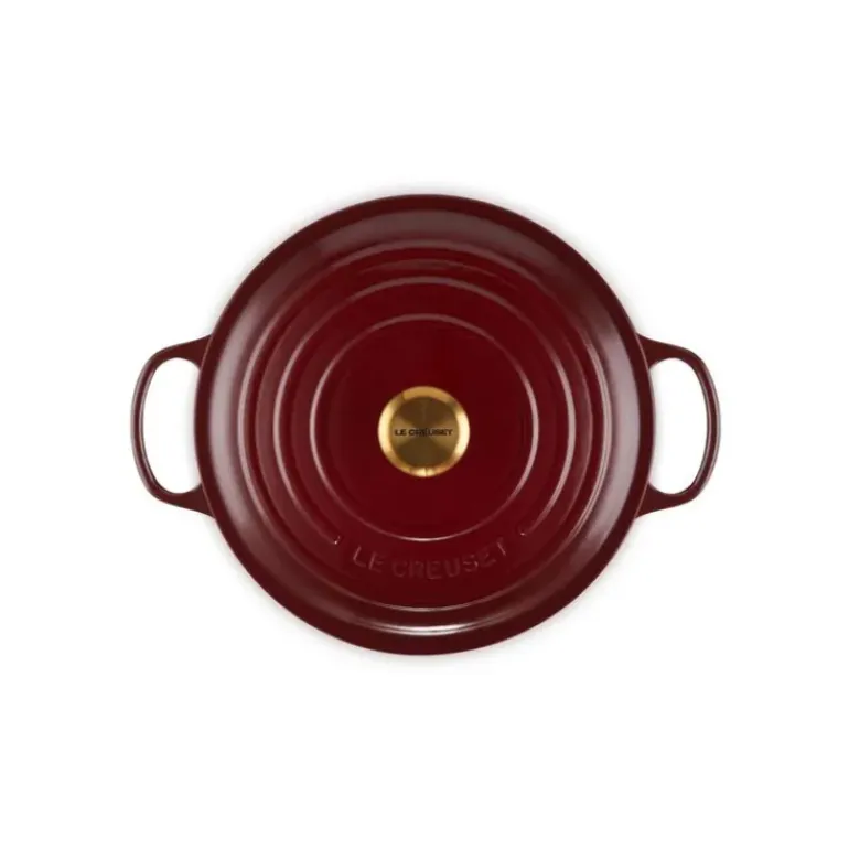 Emblème de la marque Le Creuset, produit phare conçu en France, la Cocotte en Fonte Ronde 28 cm Garnet Bouton Doré Le Creuset Signature est un véritable atout pour votre cuisine.