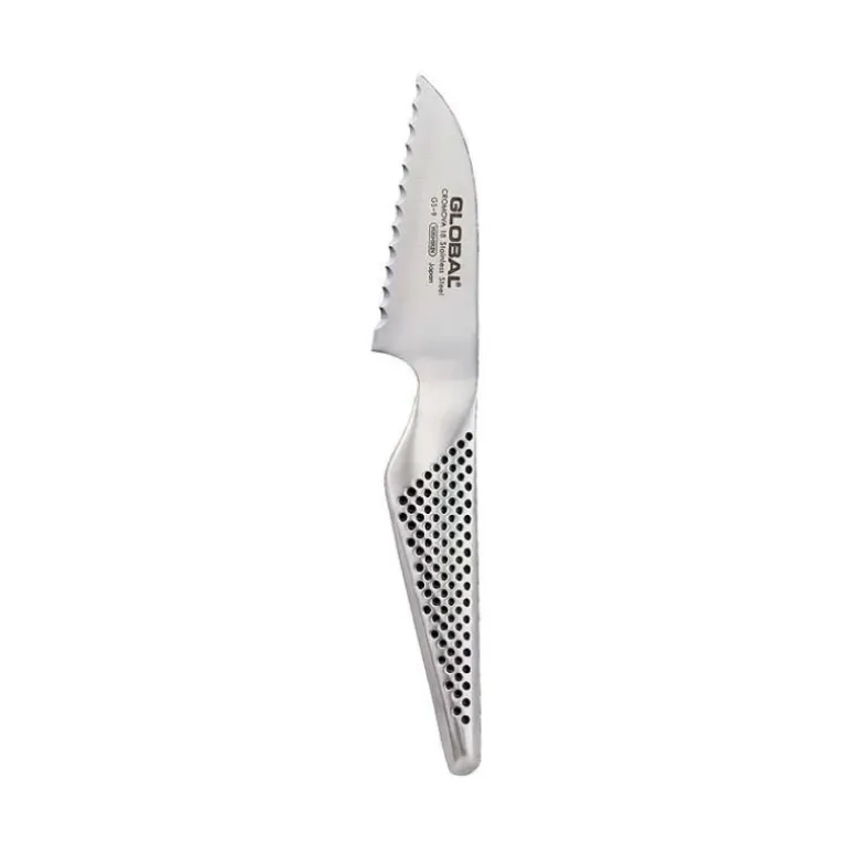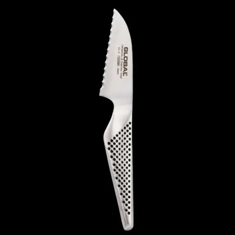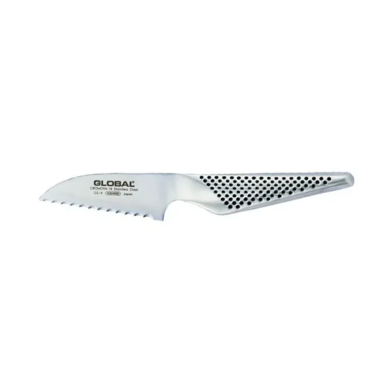 Le couteau à tomates global GS9 possède une lame crantée idéale pour couper les tomates sans les abimer.