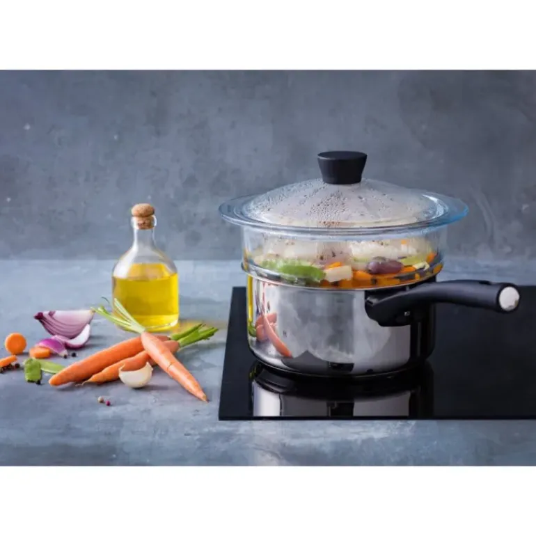 Adapté à nombre de casseroles et faitouts mesurant 20 cm de diamètre, le cuit vapeur Pyrex vous accompagnera longtemps. Sa composition en verre borosilicate évite tout transfert de goût : fini le goût du bois sur vos raviolis, et vous permet de surveiller la cuisson sans même ôter le couvercle.
