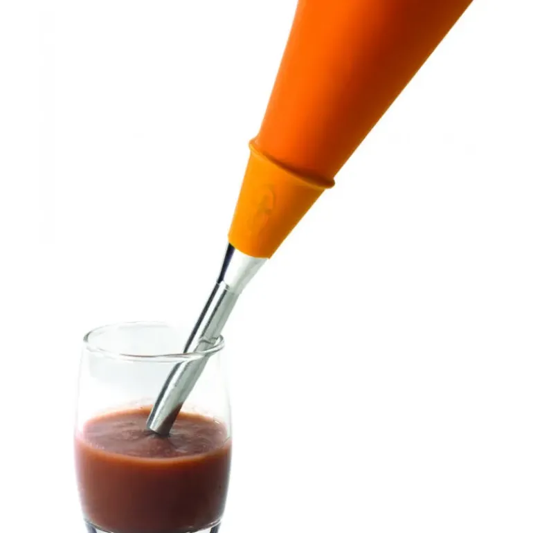 La douille à verrines présente un long tube permettant de remplir les verrines à partir du bas sans éclabousser.