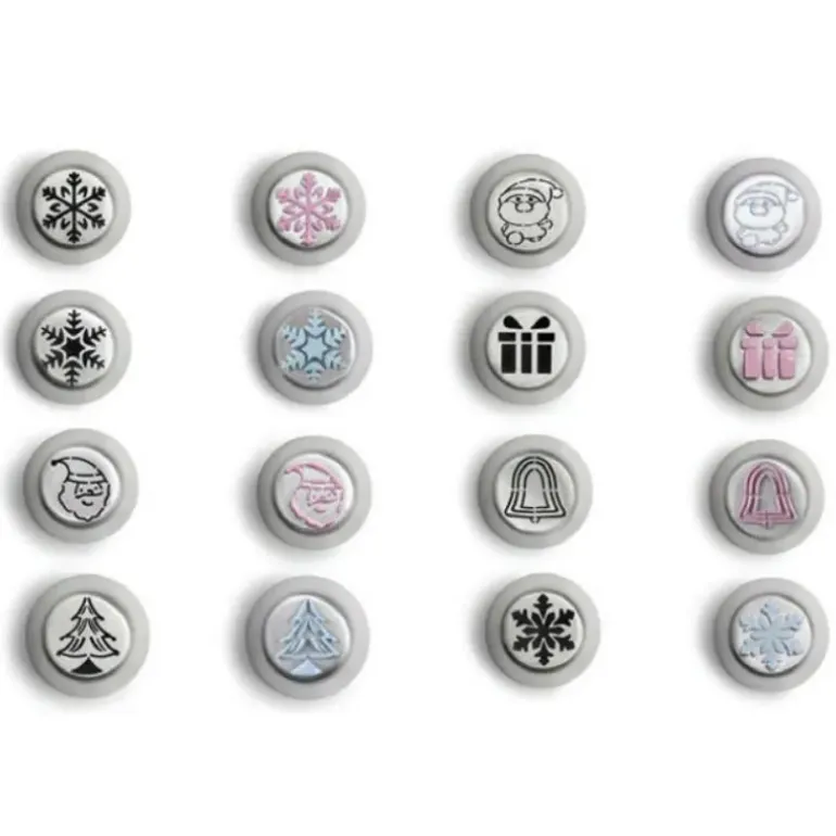 Parmi ces 8 Douilles Décors Noël vous retrouverez notamment 2 Douilles Père Noël, 3 Douilles Flocon de Neige ainsi qu’une Douille Cadeau, et bien plus encore. Ainsi, amusez vous à pocher de jolis dessins sur vos biscuits de Noël ou encore pour décorer un entremets ou une bûche de Noël.