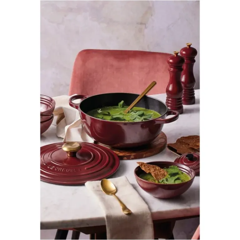 Produit historique et indémodable, la Marmite en Fonte 26 cm Garnet Bouton Doré Le Creuset Signature fait son apparition chez CuisineAddict.
