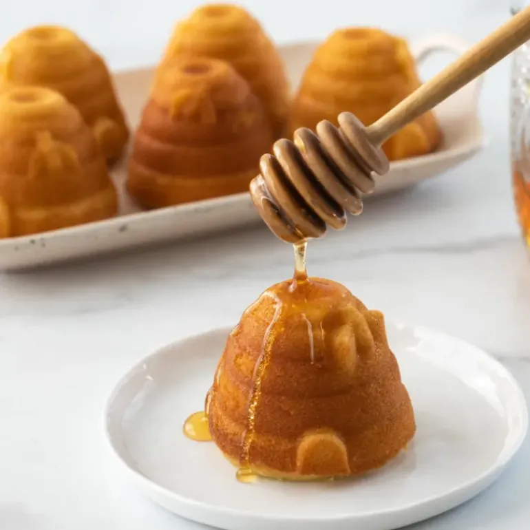 Pour pousser l’amour du miel plus loin encore, préparez dans le moule ruches Nordic Ware des gâteaux aromatisés au miel. Vous pourrez ainsi joindre l’aspect au goût de ces desserts uniques. Pour un pique-nique, un goûter d’anniversaire, ou bien pour accompagner un thé floral, choisissez la forme printanière du moule à gâteaux ruches.