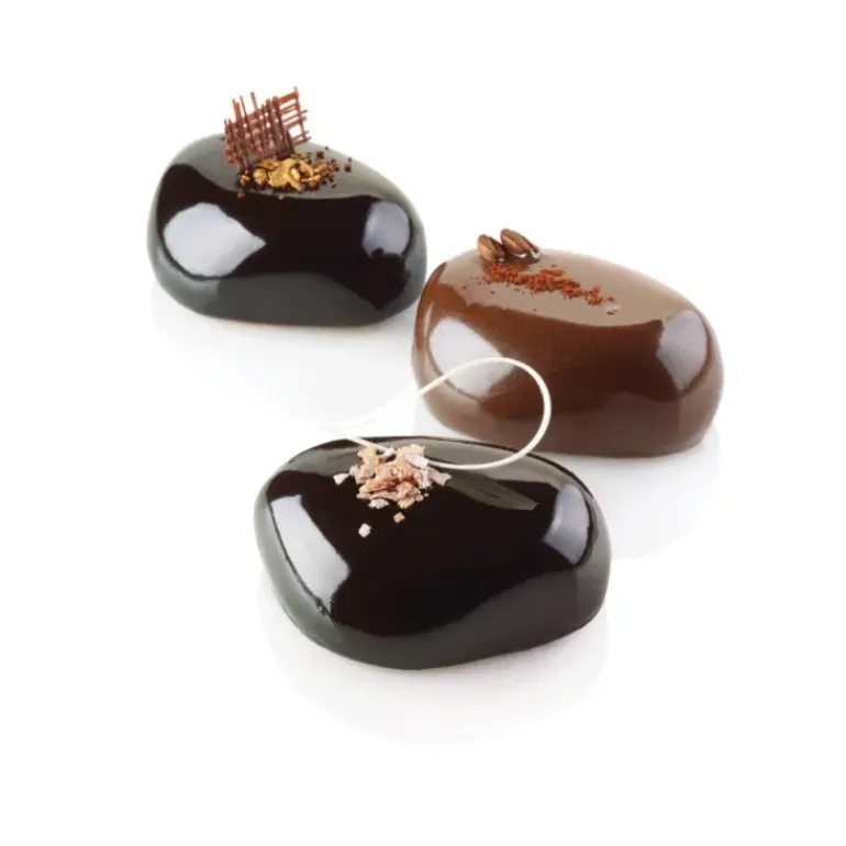 Restez zen en toutes situations et même en cuisine ! Si vous souhaitez vous lancer le challenge de proposer un repas entièrement tourné autour du thème de la zénitude, procurez-vous le Moule Silicone 6 Galets 8,7 x 6,3 cm 110ml SilikoMart Professional ! Ce moule entièrement composé de silicone dispose de 6 empreintes d’une capacité de 110 ml. Celles-ci prennent la forme de galets, symbole représentatif du bien-être que l’on retrouve souvent dans les jardins japonais. Les galets se retrouvent également empilés et ornent les rives des lacs, lieux de méditation et de repos. Réalisez donc des galets plus vrais que nature à l’aide du moule silicone Silikomart, idéal pour des petites bouchées, décors et inserts ! Une fois votre préparation aisément démoulée, recouvrez vos petites bouchées de glaçage miroir pour leur donner une surface lisse et brillante !
