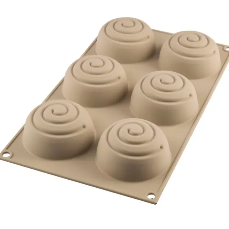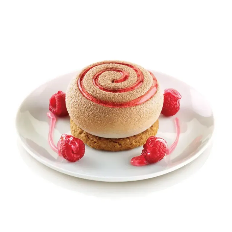 Grâce au moule silicone Mini Girotondo Silikomart 3D Design, vous obtiendrez 6 pâtisseries parfaitement rondes et légèrement bombées. La rondeur du gâteau est soulignée par le sillon présent sur la surface. Alliez esthétique et saveur en versant dans le sillon une crème, un coulis de fruits ou de chocolat, dont la couleur tranchera avec celle du gâteau.