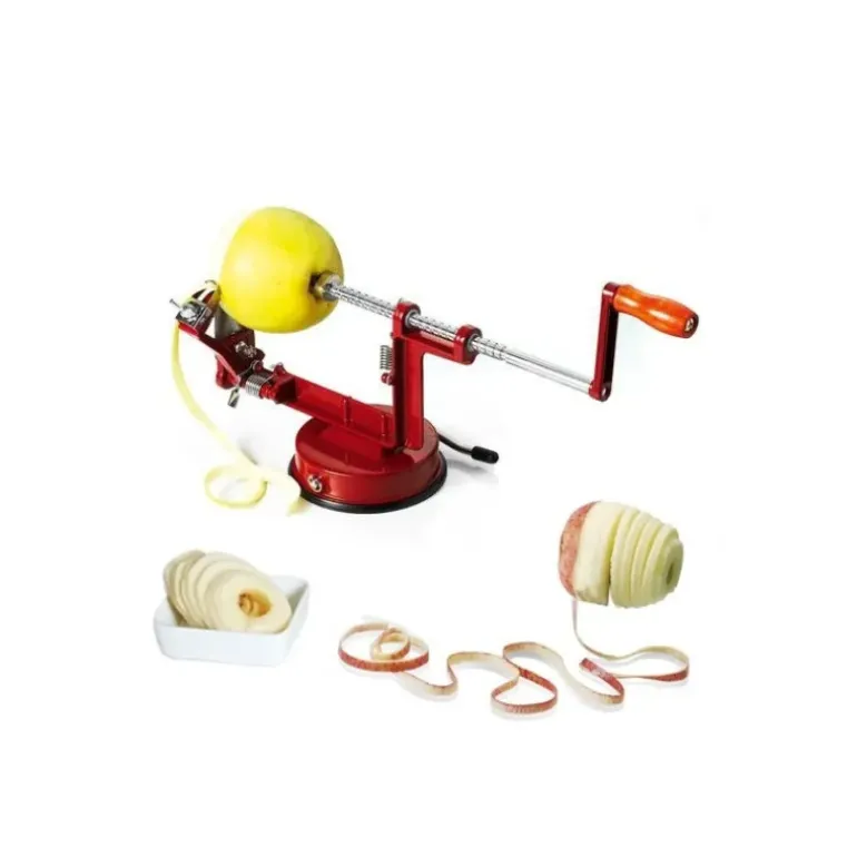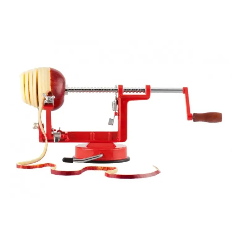Le pèle-pommes rouge pompier présenté par Tellier, vous permet rapidement et en un tour de manivelle de peler, trancher et étrogner votre fruit.