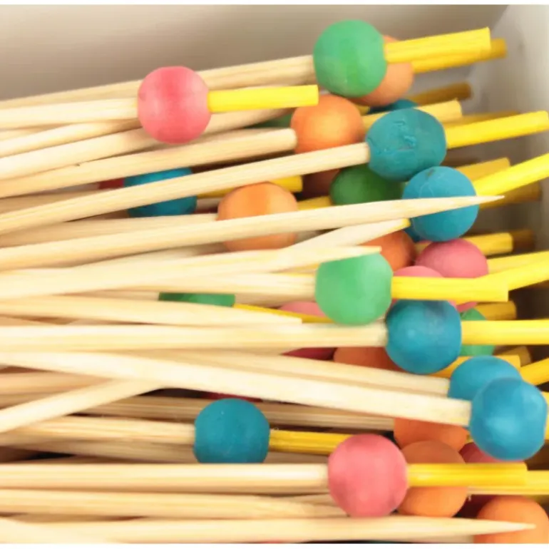 Ces piques cocktail à boule se déclinent en quatre couleurs (vert, rose, bleu, orange) et sont aussi idéals pour faire des brochettes et les présenter en apéritif.
