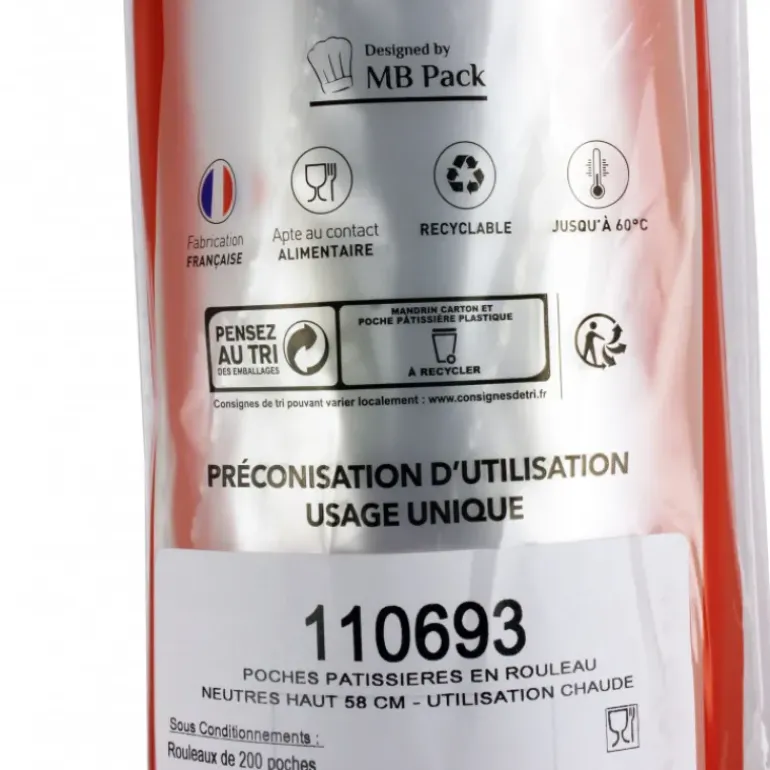 Pour pocher de grandes quantités de mousse ou de ganache : cette Poche Pâtissière de 58 cm de hauteur sera idéale. Conditionnées en un rouleau de 200 Poches à Douilles, ces Poches Pâtissières Conik sont adaptées pour les préparations chaudes comme froides.