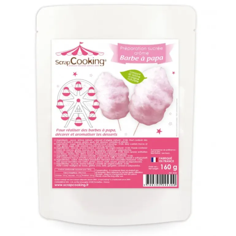 Avec cette préparation sucrée de Scrapcooking, réalisez facilement de délicieuses Barbe à papa roses, comme dans les fêtes foraines ! Il suffit de verser la poudre dans la machine sans aucun ajout pour que les films de sucre typique de la barbe à papa se forment.