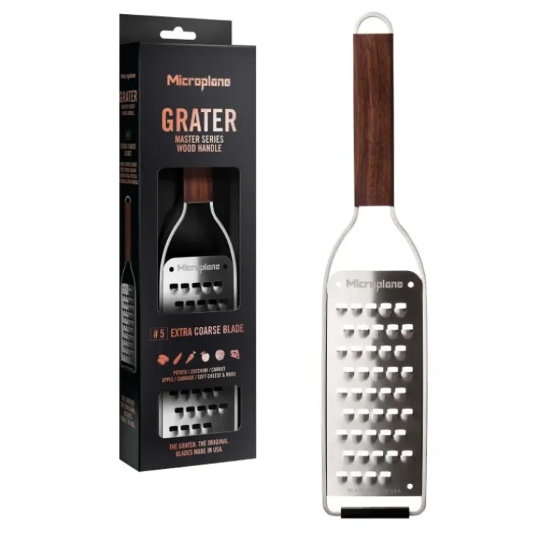 Chaque râpe de cuisine de la gamme Microplane Master se distingue aisément grâce à son élégant manche en noyer et à sa lame brillante en acier inoxydable de haute qualité. Ce style unique fait de cette collection non seulement des râpes de qualité professionnelle, mais également des ustensiles de cuisine sublimes qui ajouteront du charme à votre cuisine.