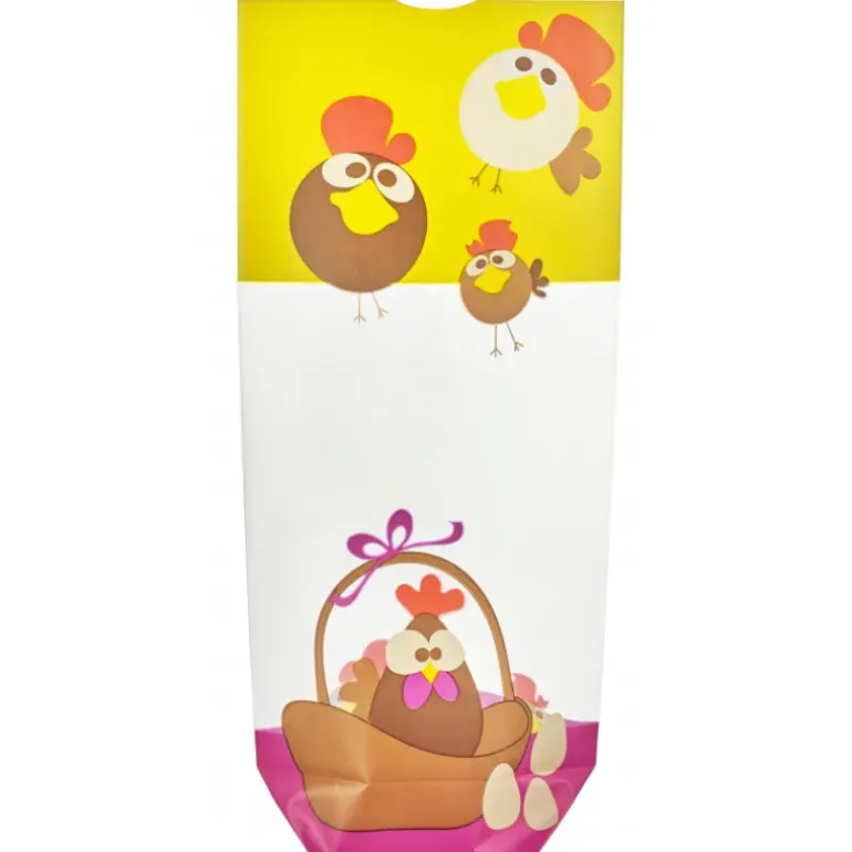 Le sachet avec fond cocotte se pare d’un motif de Pâques, représentant quatre poules, des oeufs et un panier. Le centre du sachet avec fond est transparent, laissant apercevoir son contenu gourmand. Vous pouvez nouer un ruban sur le sachet avec fond cocotte afin de fermer le sachet tout en soignant la présentation finale.