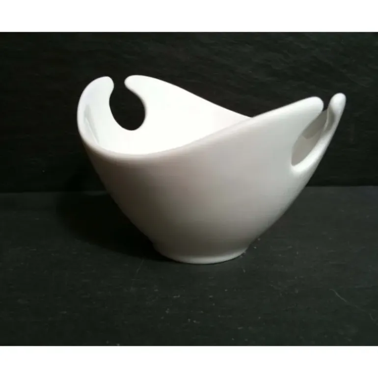 LeBrun présente ce joli saladier Jonque en porcelaine blanche en forme de coque. Le saladier est accompagné de son service à salade en inox.