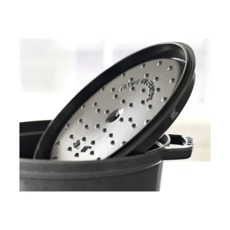 - Les secrets du couvercle STAUB : moins d’humidité s’échappe durant la cuisson 10% d’humidité en plus est retenue à l’intérieur de la cocotte. Le système d’arrosage constitué de picots répartis sur la surface intérieure plate du couvercle assure un effet « gouttes d’eau » tombant en continu sur les aliments.