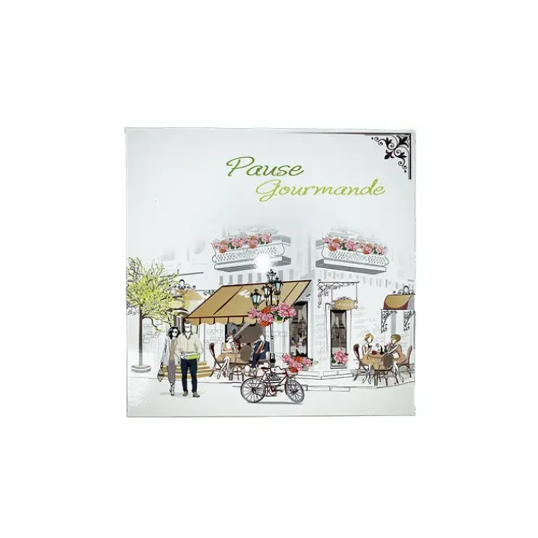 Ces boîtes pâtissières sont illustrées d’une jolie terrasse parisienne pleine de vie avec des touches de couleurs pastels. Ces boîtes cartonnées sont fabriquées en France.