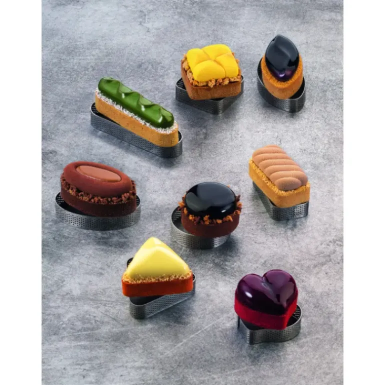 Compatible avec le moule silicone pyramide et le cercle à tarte triangle 7,5 x 6,5 cm, ce Cercle à Tarte Micro-Perforé pourra servir pour la confections de tartes individuelles extra gourmandes ! Fait en inox, ce Cercle Individuel Triangle Pavoni vous suivra dans toutes vos aventures pâtissières.