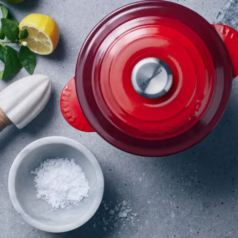 La cocotte en fonte Every Le Creuset est robuste (garantie à vie) son intérieur en émail noir mat vous assure résistance dans le temps et aux rayures. La cocotte haute rouge cerise est munie de deux couvercles : un couvercle bombé en fonte et un couvercle intérieur anti-débordement en céramique. Ce dernier est muni de deux perforations assurant ainsi l’évacuation de la vapeur et la bonne hydratation lors de la cuisson pour des aliments savoureux et tendres.