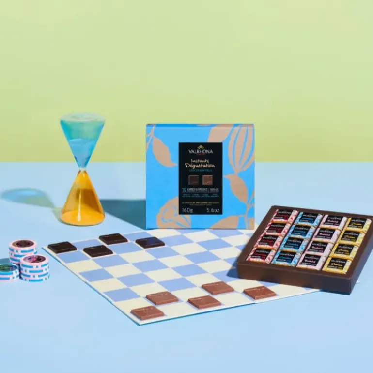 Délectez-vous des saveurs du chocolat Valrhona en les dégustant dans ce Coffret 32 Carrés de Chocolats Noir et Lait Les Essentiels 160 g Valrhona.