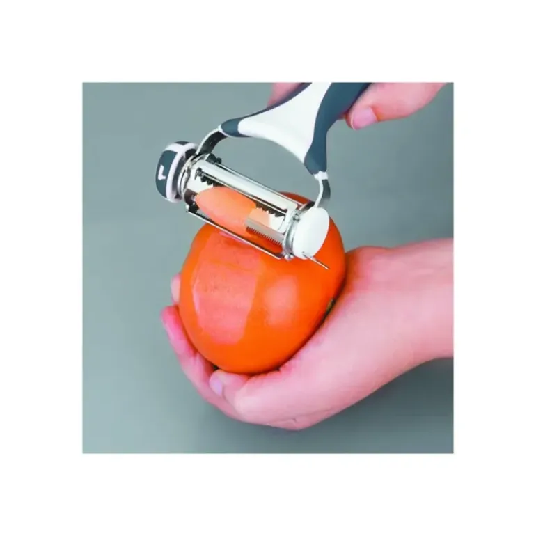 Pratique et utile, il prend peu de place : l’éplucheur à légumes 3 lames est simple à utiliser. Il est composé d’une molette rotatives qui vous permet de changer de lame quand vous le souhaitez… Pour peler vos tomates avec sa lame dentelée, préparer votre julienne de légumes, ou simplement éplucher vos légumes avec sa lame lisse, il répondra à toutes vos envies ! Son manche ergonomique vous promet une prise en main facile et un usage plus que simple.
