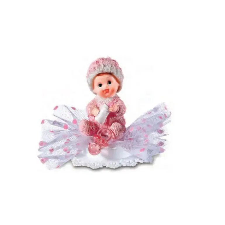 Figurine bapteme fille spéciale pièce montée conçue sur un disque (socle) rigide blanc pour être posée facilement et sans risque de chute sur le sommet de votre gâteau. Avec son tulle blanc agrémenté de pois rose, ce sujet de bapteme sera parfait pour célébrer la naissance ou le bapteme de votre petite fille.