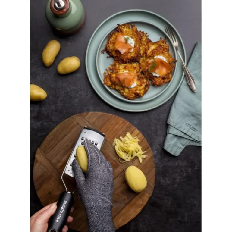 Fabriqué dans un tricot sans fil et sans coutures, ce gant de cuisine résiste aux coupures pour vous permettre de râper, trancher, couper vos aliments en toute confiance. Le gant de protection anti-coupure est spécialement conçu pour s’utiliser avec les produits Microplane, qui bénéficient de lames ultra-tranchantes. Il n’y a aucun risque de s’égratigner en les utilisant grâce à ce gant souple très résistant.