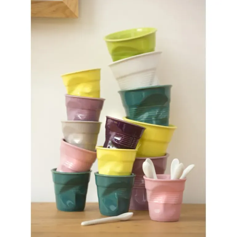 Les Froissés : Cette collection originale détourne un gobelet en plastique froissé en porcelaine. Les articles froissés Revol sont à la fois des accessoires de décoration mais également des ustensiles de cuisson! Le modèle du gobelet froissé Revol existe depuis l’année 2000 et n’a pas pris une ride!