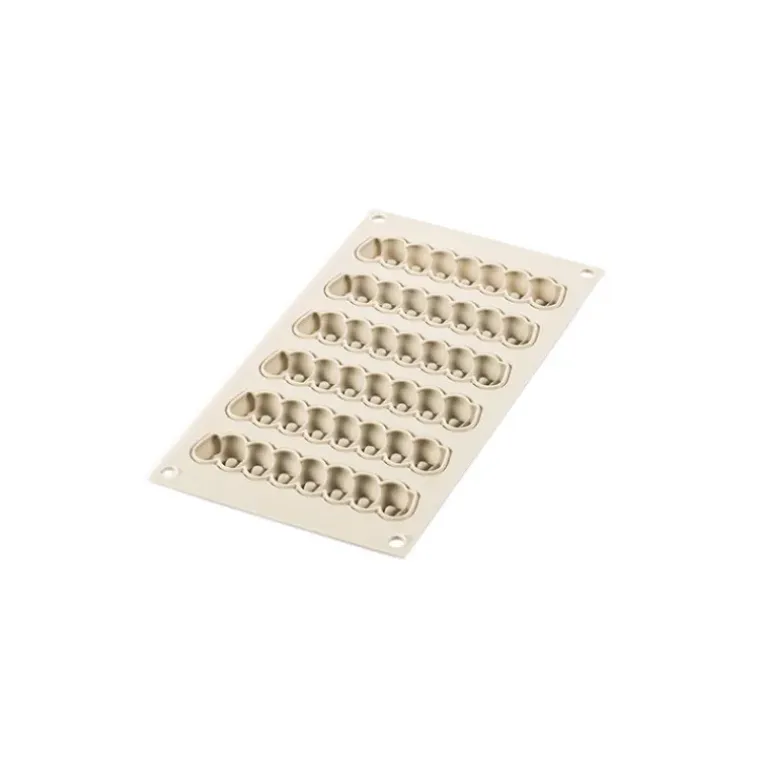 Le premier moule silicone Silikomart 3D Design servira à confectionner la base du dessert, qui peut reposer sur un biscuit, une génoise ou encore un entremets. Il se compose de 6 empreintes ovales de 13 x 3.8 x 4 cm.