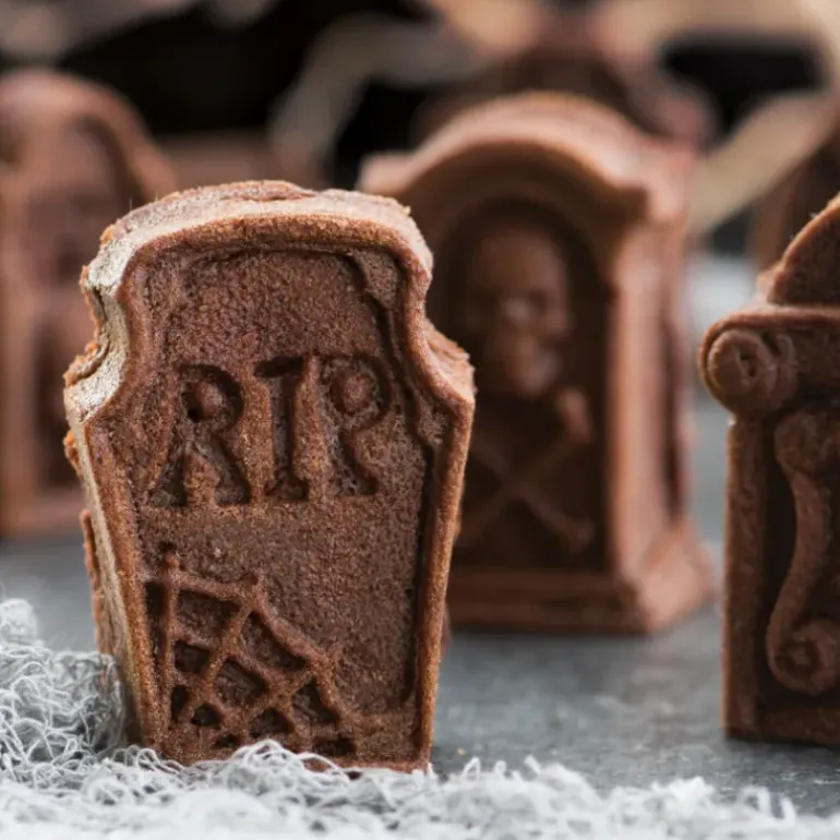 Une fois cuits et décorés, vos gâteaux pourront être mis en scène sur votre table avec des biscuits en miettes afin d’imiter la terre retournée d’un cimetière. Laissez vos invités observer chacun des effroyables détails de ces pierres tombales gourmandes avant de passer à la dégustation.