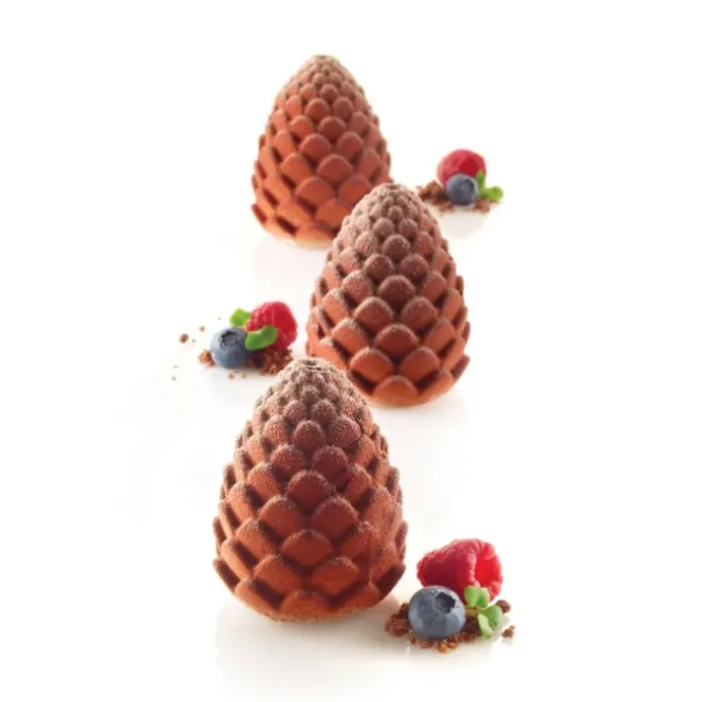 Le support plastique fourni avec ce moule en silicone vous permettra de travailler en toute stabilité. En portions individuelles ou réunies dans un dessert à partager tout simplement intitulé « cueillette en provenance de la forêt » vos pommes de pin gourmandes feront sensation auprès de vos invités.