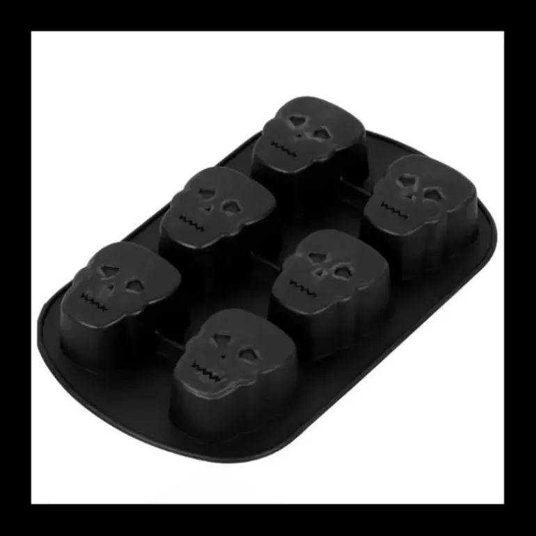 Fabriqué en silicone de haute qualité, ce moule gâteau Halloween dispose de 6 empreintes identiques en forme de crâne ou tête de mort, parfait pour Halloween. D’une dimension de 17 cm de large pour 27 cm de long, ce moule silicone est paré d’une teinte noire pour coller au thème de l’horreur jusqu’au bout du détail.