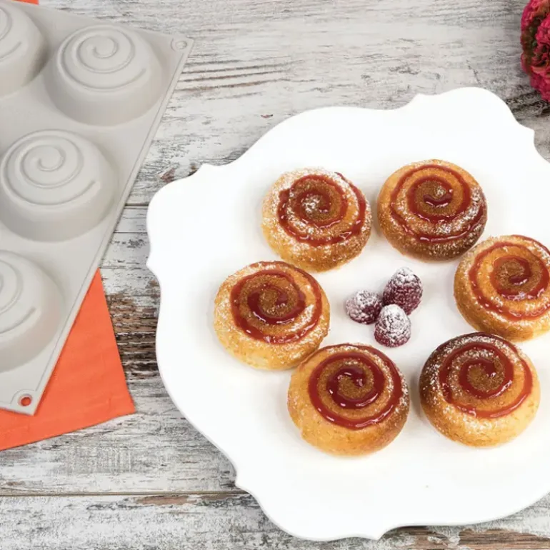 Grâce au moule silicone Mini Girotondo Silikomart 3D Design, vous obtiendrez 6 pâtisseries parfaitement rondes et légèrement bombées. La rondeur du gâteau est soulignée par le sillon présent sur la surface. Alliez esthétique et saveur en versant dans le sillon une crème, un coulis de fruits ou de chocolat, dont la couleur tranchera avec celle du gâteau.