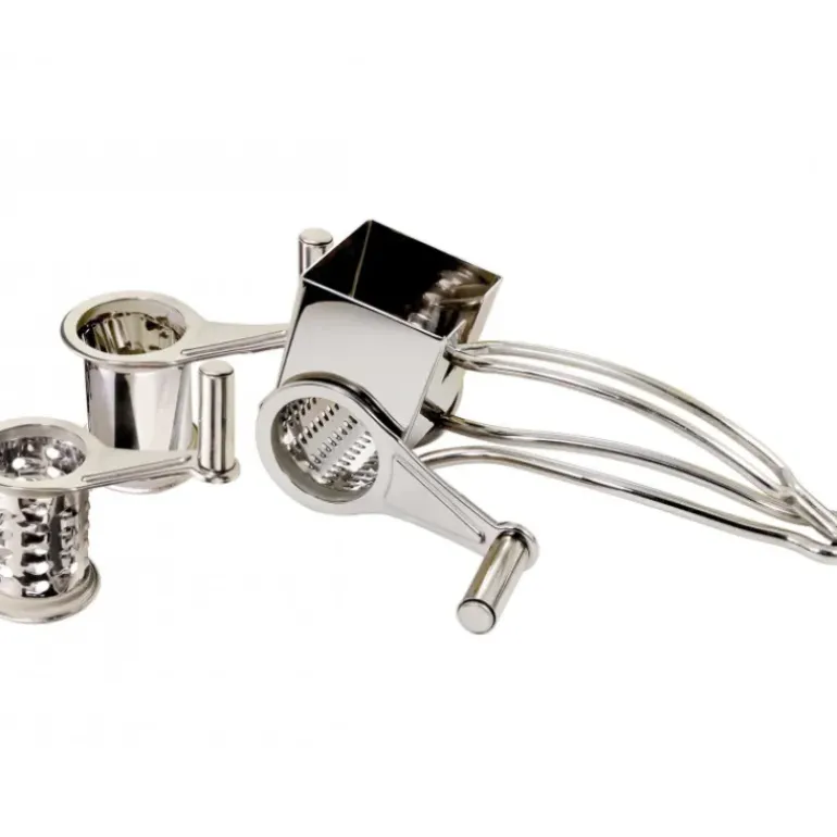 Inox et ambidextre. muni de 3 tambours : un tambour gruyère pour râper les fromages à pâte dure, un tambour crudité pour les fruits et légumes (ou râper gros le parmesan) et un tambour rondelle pour obtenir de jolis copeaux ou lamelle de comté.