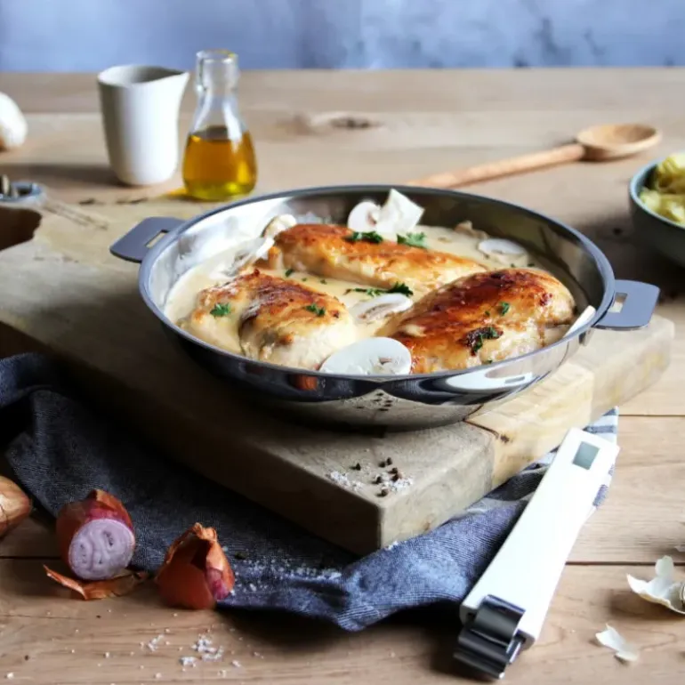Cette poêle inox Cristel est issue de la collection Mutine Amovible. Ainsi, une fois la poignée (vendue séparément) retirée votre poêle Cristel se transforme en un élégant plat de cuisson, à apporter à table ou bien à placer au four pour terminer vos cuissons.
