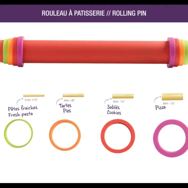Pratique ! Voici un rouleau à pâtisserie ajustable. Grâce à 4 paires d’anneaux, vous allez pouvoir choisir l’épaisseur de pâte voulu. Il suffit de fixer de chaque côté du rouleau la paire d’anneaux de la hauteur voulu. Ainsi pour les pâtes fraîches, prenez les plus petits anneaux pour obtenir une pâte de 2mm d’épaisseur. Pour les cookies, obtez plutôt pour une épaisseur de 4 mm, pour la pâte à tarte 6mm et pour de bonnes pâtes à pizza l’épaisseur 8 mm sera parfaite.