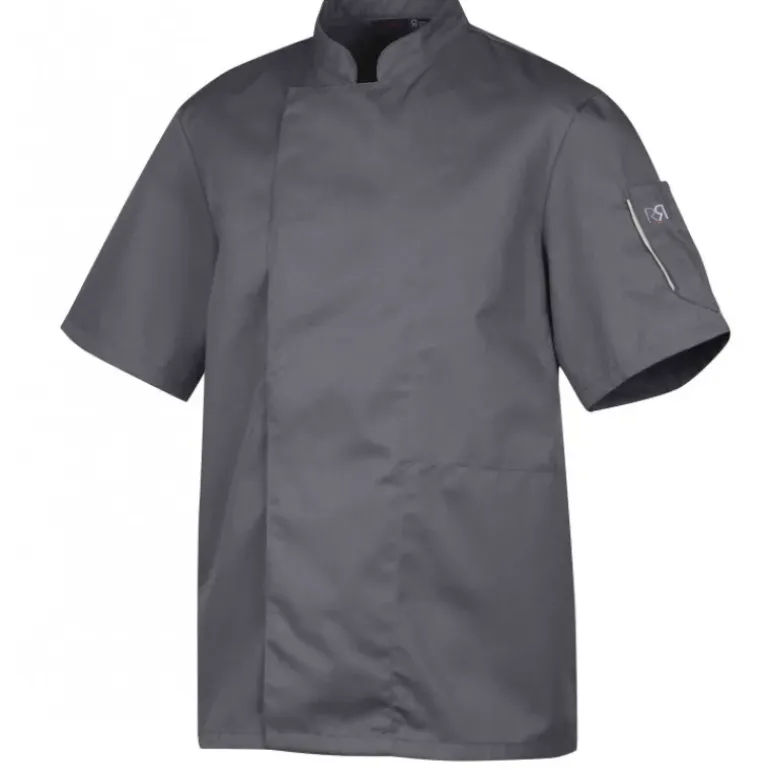 La veste de cuisine mixte Robur NERO se ferme par une rangée de boutons pressions cachés. Dotée de manches courtes, elle se pare d’un col officier qui lui apporte modernité et élégance. Sur une des manches est cousue la poche stylo.